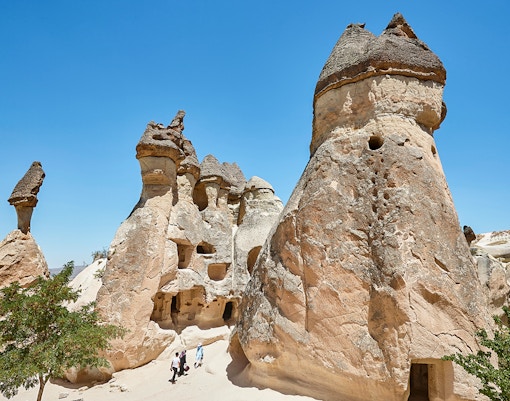 Wandern Sie zwischen den natürlich geformten Felsformationen Kappadokiens, wo vom Wind geschnitzte Säulen Kamele, Delphine, Robben und andere Formen darstellen. Die Führer zeigen Ihnen die fotogensten Silhouetten und Aussichtspunkte, während Sie dieses verträumte, sandfarbene Tal erkunden.