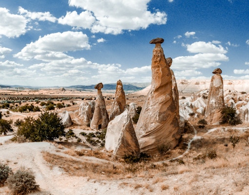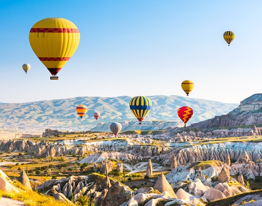 Fliegen Sie bei Sonnenaufgang über die Täler und beobachten Sie, wie Hunderte von Feenschornsteinen in Kappadokien unter Ihnen leuchten. Von oben sehen Sie das goldene Licht, das auf die Felsspitzen trifft, die Kurven des Love Valley und die surreale Landschaft, die sich über Kappadokien in der Türkei erstreckt. Es ist die kultigste Art, die Schönheit der Region zu erleben.