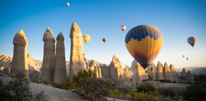 Genießen Sie bei einer malerischen Heißluftballonfahrt über dem Göreme-Tal den atemberaubenden Blick auf Kappadokiens Feenkamine bei Sonnenaufgang.