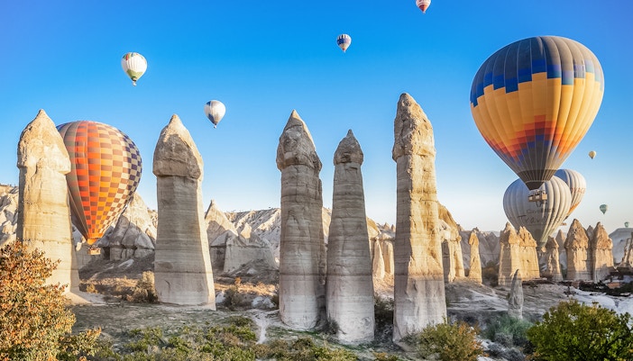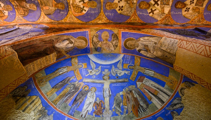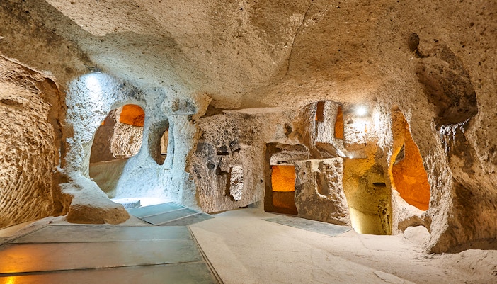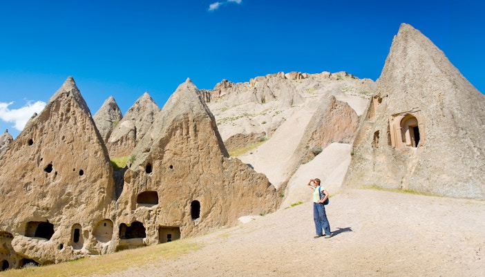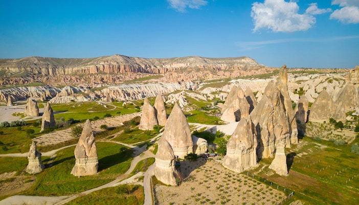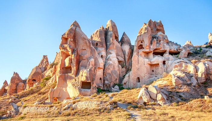 I camini delle fate di Goreme sembrano quasi irreali: alte formazioni rocciose scolpite da secoli di vento, pioggia e cenere vulcanica. Camminando tra di esse, noterai come un tempo le persone scolpivano case, cappelle e magazzini direttamente nella pietra. È un luogo raro in cui la geologia naturale e la storia umana si fondono perfettamente.
