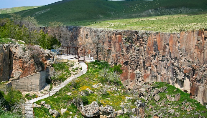 Prachtige canyonwandeling langs de rivier de Melendiz met grotkerken die in de kliffen zijn uitgehouwen.