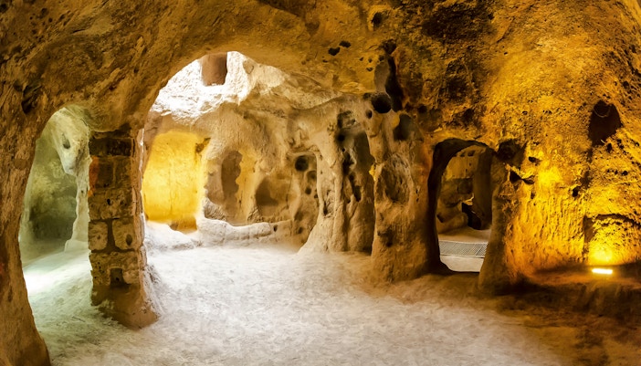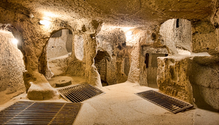 - Ventilasjonssjakter, rullesteinsdører, trange tunneler og dype nivåer er vanlige trekk. Det finnes rundt 200 slike underjordiske byer i Kappadokia-regionen, men bare en håndfull av dem er åpne for vanlige besøkende.